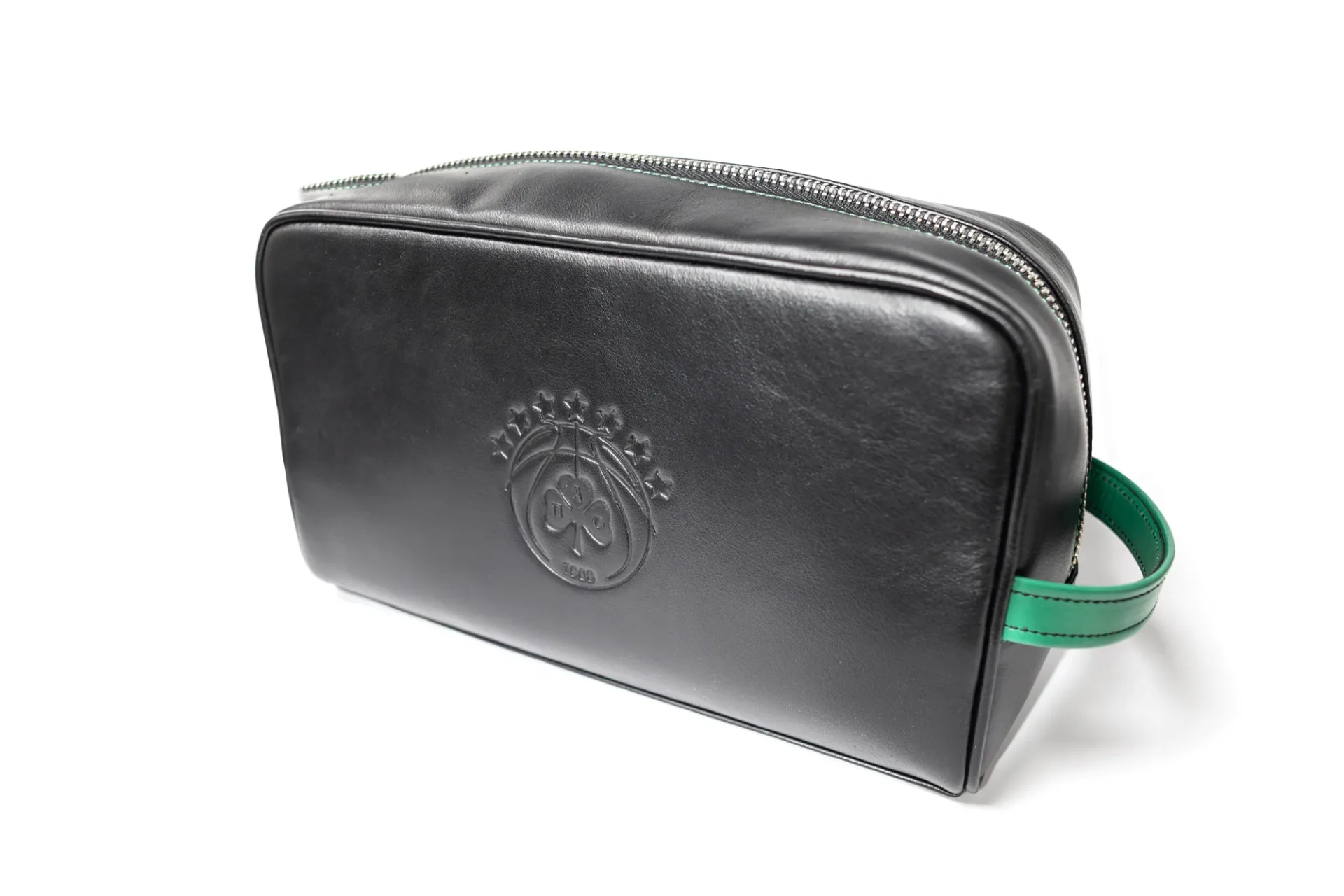 Οργανώστε τα προσωπικά σας είδη με την υπογραφή του Πρωταθλητή Ευρώπης. Αυτό το premium νεσεσέρ διαθέτει κομψό μαύρο φινίρισμα με ανάγλυφο το έμβλημα της ομάδας με τα 7 αστέρια. Ο λειτουργικός του σχεδιασμός περιλαμβάνει στιβαρό φερμουάρ και μια εντυπωσιακή πράσινη δερμάτινη λαβή για εύκολη μεταφορά. Ιδανικό για τα ταξίδια σας ή το γυμναστήριο, συνδυάζει την πολυτέλεια με την οπαδική υπερηφάνεια.