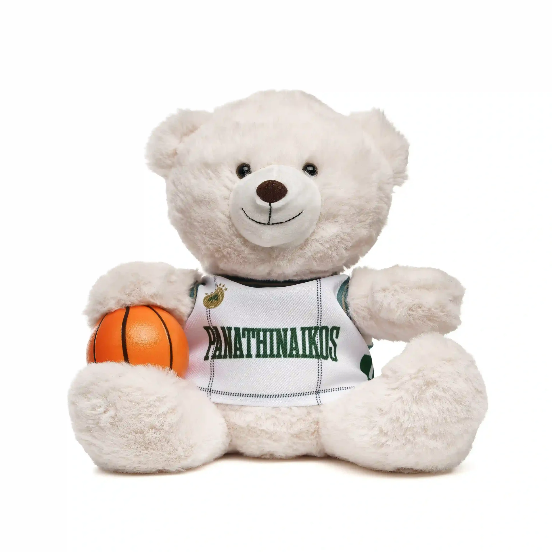 Απαλό λευκό λούτρινο αρκουδάκι που φοράει την επίσημη λευκή φανέλα του Παναθηναϊκού. Κρατάει μια μπάλα μπάσκετ και αποτελεί το ιδανικό δώρο για τους μικρούς φίλους της ομάδας, συνδυάζοντας το παιχνίδι με την αγάπη για τον Σύλλογο.